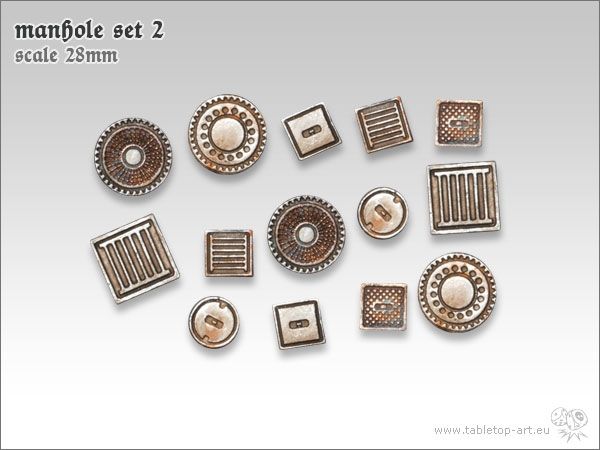 Tabletop-Art Manhole Set 2 (Putdeksels set 2) (TTA601042) bevat 14 resin ongeschilderde put of riooldeksels voor 28-30mm miniaturen. De set bevat 7 verschillende soorten kisten, waarvan er ieder 2 in de verpakking zitten.