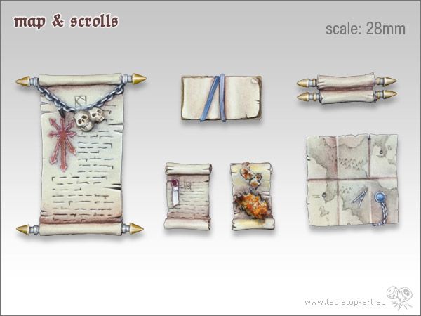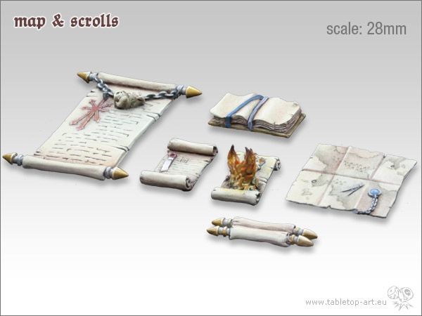 Tabletop-Art Map & Scrolls (TTA600026)Â bevat 1 landkaart, 4 scrollen en 1 opengeslagen boek. De miniaturen zijn gemaakt van resin en speciaal voor 28mm diorama's ontwikkeld.