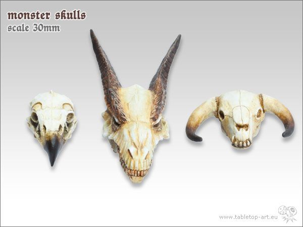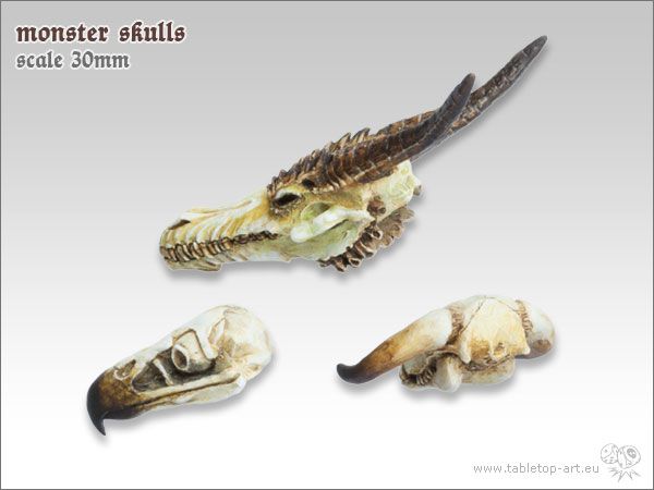 Tabletop-Art Monster Skull Set (TTA6000331). De set bestaat uit 3 verschillende Monster Skulls. Schedels van gevaarlijke monsters: een vogel achtige, een gehoornd zoogdier en een draak. Voor de grootte, de drakenschedel is wel 5cm lang._x000D_