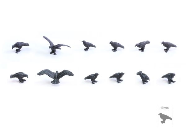 Tabletop-Art Raven Set (TTA601059). De set bestaat uit 6x verschillende raven (vogels). Ze kunnen op diverse manieren in elkaar gezet worden voor andere houdingen. Perfect voor op kastelen, hekken en begraafplaatsen._x000D_