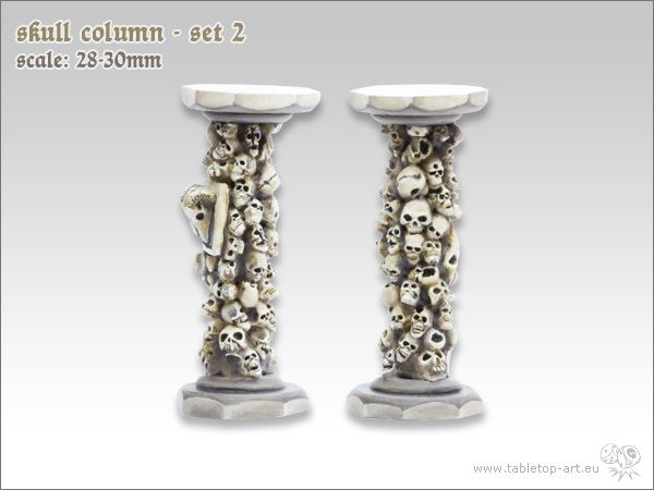 Tabletop-Art Skull Column set 2 (TTA600022) bevat 2 resin ongeschilderde kolommen met schedels speciaal voor 28mm miniaturen. De set bevat 2 verschillende soorten columns, waarvan er ieder 1 in de verpakking zitten. De schedel kolommen zijn gemiddeld 60mm hoog en de basis heeft een diameter van 18mm.
