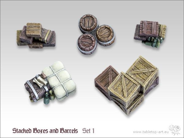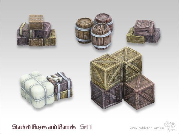 Tabletop-Art Stacked boxes and Barrels set 1 (TTA600016). De set bestaat uit 5x verschillende stapels kisten, dozen, tonnen, vaten en flessen. Perfect om ergens in een hoek bij een winkel of magazijn te zetten. Misschien wel bij een garage of in een stoffige kelder._x000D_