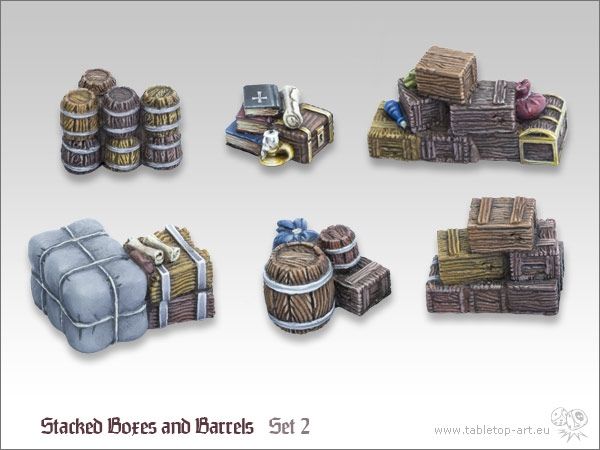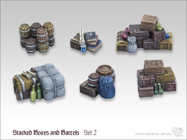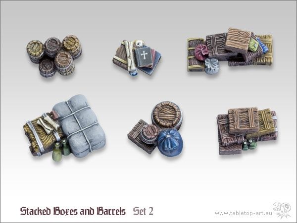 Tabletop-Art Stacked Boxes & Barrels 2 (Gestapelde kisten en tonnen set 2) (TTA600017) bevat 6 stapels miniatuurkisten en tonnen. De miniaturen zijn gemaakt van resin en speciaal voor 28mm diorama's ontwikkeld.