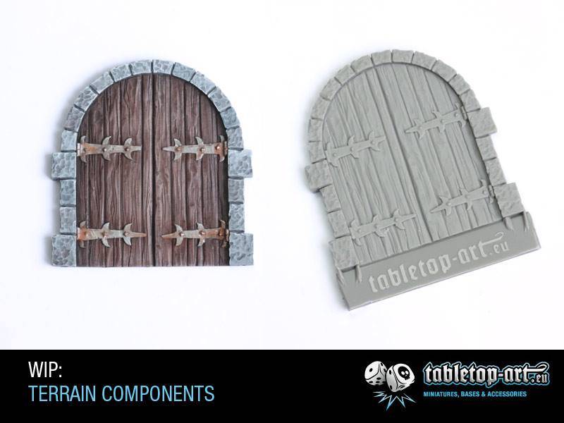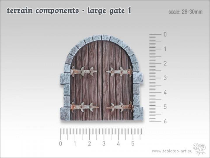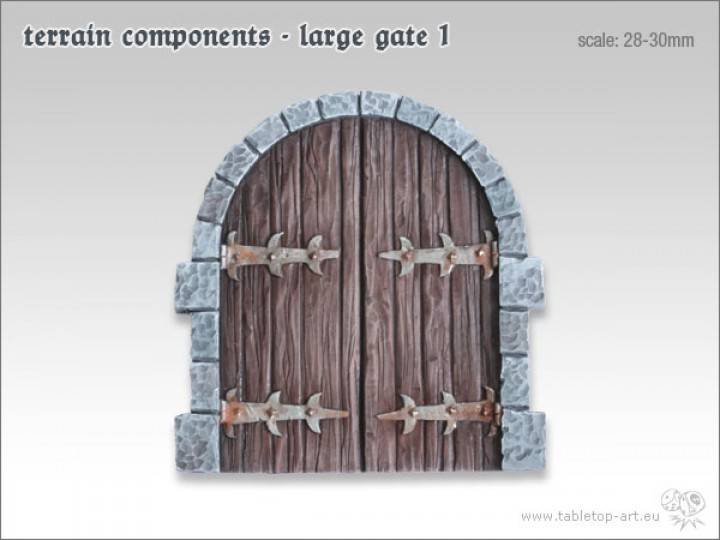 De set bestaat uit een grote gesloten houten poort met stevige scharnieren dat op een gebouw bevestigd kan worden.