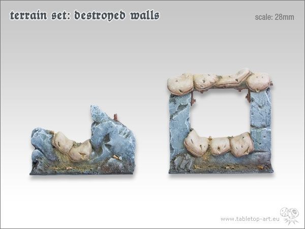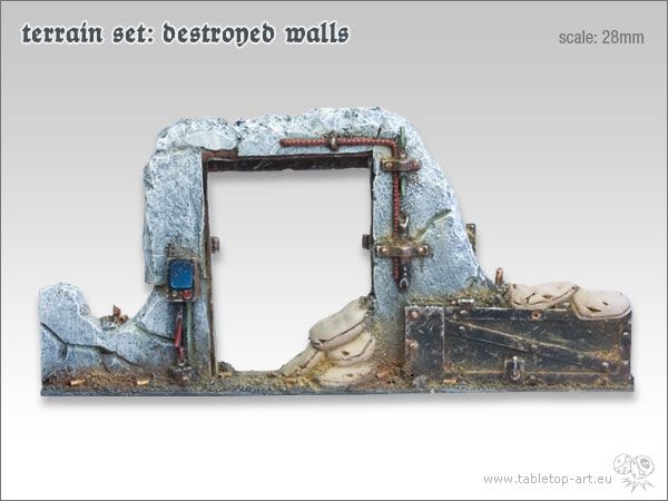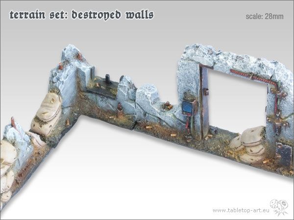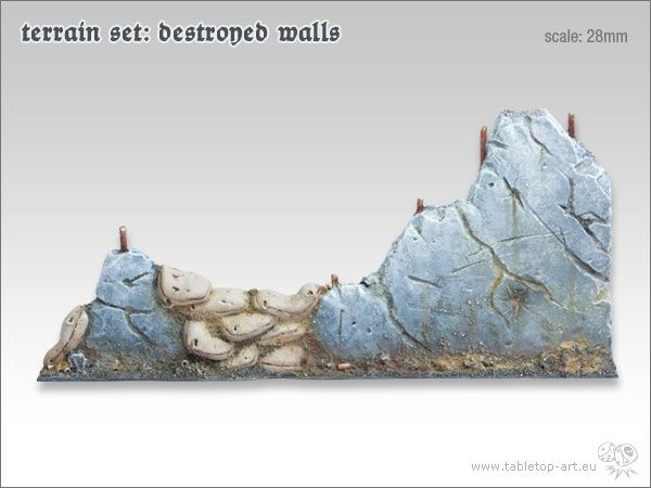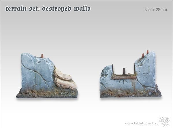 Tabletop-Art Terrain Set - Destroyed Walls (TTA601031) De vervallen muren zijn bezaaid met kogelhulzen en puin en zijn bovendien beveiligd met zandzakken. De 6 onderdelen uit deze set zijn gemaakt van hoge kwaliteit resin en zijn gemaakt voor 28mm wargames.