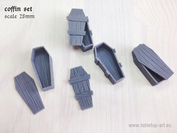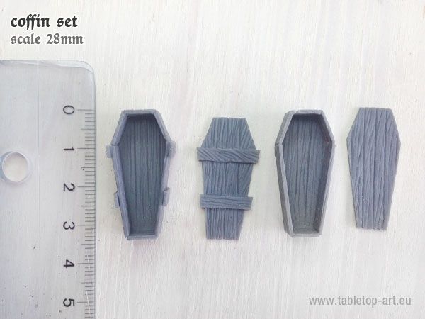 Tabletop-Art Wood coffins set (Grafkisten) (TTA601048) bevat 4 resin ongeschilderde grafkisten voor 28-30mm miniaturen. De set bevat 2 verschillende soorten kisten, warvan er ieder 2 ni de verpakking zitten. De kisten moeten nog gelijmd worden, maar zijn daardoor wel aan beide zijden gedetailleerd en kan de deksel van de kist gelaten worden.