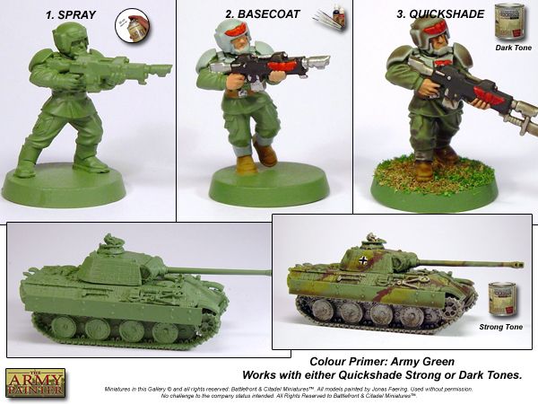 Het fijne pigment maakt deze Colour Primer Army Green - grijsgroene kleur primer de perfecte grondverf voor alle schilderprojecten. De verf droogt snel en houdt ieder detail op het model in perfecte conditie. Voeg nog wat extra details toe met kleur aan de miniatuur en dip het daarna in Quickshade. De groen grijze kleur van Army Green zorgt dan al voor het meeste werk! Zoals hieronder in het filmpje ook met rood te zien is.