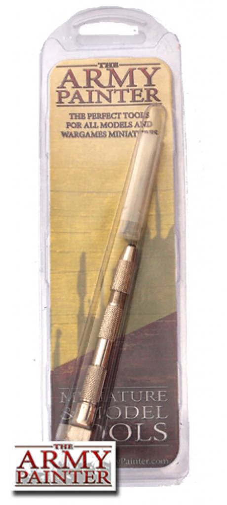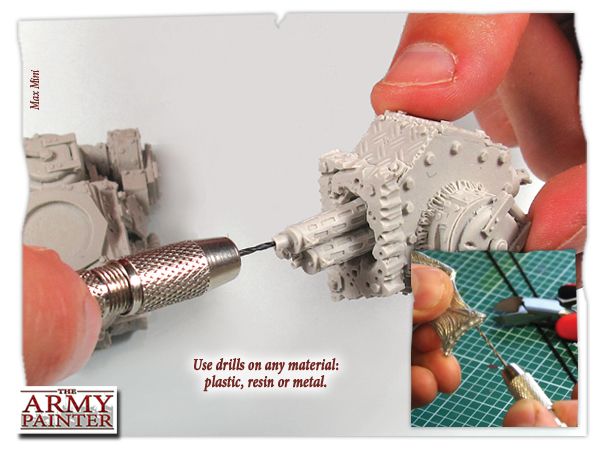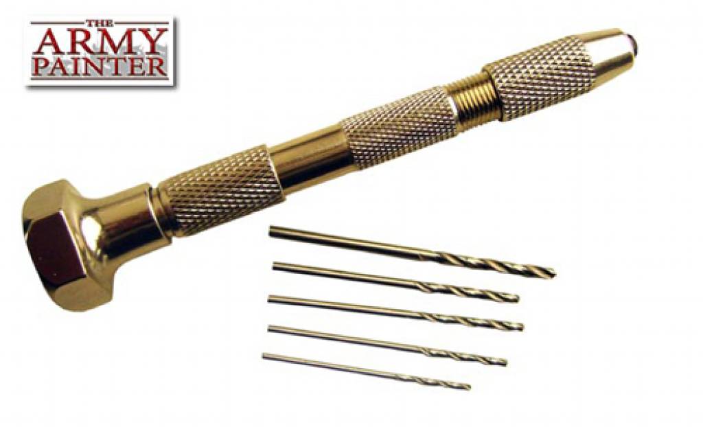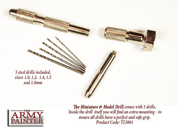 The Army Painter Drill, dit geweldige handboortje is handig voor het converten van modellen. Met dit handboortje is het heel eenvoudig kleine gaatjes in plastic of metalen modellen te boren (bijvoorbeeld voor schietgaten). Meestal wordt het echter gebruikt om grotere onderdelen steviger met elkaar te verbinden door een zogenaamde miniatuur pen-gat-verbinding. Hierbij boort u een gaatje in beide onderdelen en verbindt deze door middel van een stukje ijzerdraad (paperclip bijvoorbeeld). Bij dit boortje worden 5 boortjes in verschillende maten geleverd die op te bergen zijn in de boor zelf.