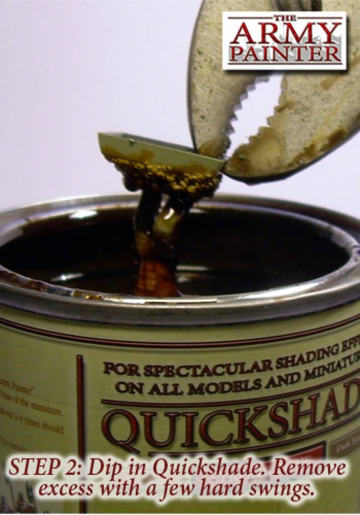 Om Quickshade te gebruiken worden de miniaturen "gedipt" in de Quickshade waarna ze 24 uur moeten drogen. De hoge glans die er daarna overblijft kan eventueel met de "Anti-shine" spray gematteerd worden.
