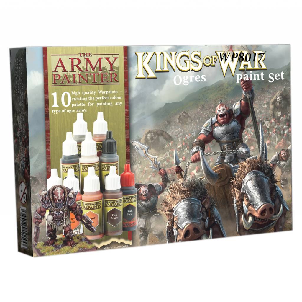 The Army Painter Warpaints Kings of War Ogres Paint Set van 10 kleuren. De Ogres van Mantica zijn een taai ras, afkomstig uit het ruwe klimaat van de Mammoth Steppe in het noorden. Dit rijk van taai grasland en ijzige plateaus is verre van gastvrij. Een hard leven wacht elke mens roekeloos genoeg om zich daar te vestigen. Ondanks hun rough-and-ready verschijning zijn Ogres niet alleen monsters. Ze zijn gewiekste vechters en scherpzinnige onderhandelaars, ze drijven handel als huurlingen over de hele wereld.
