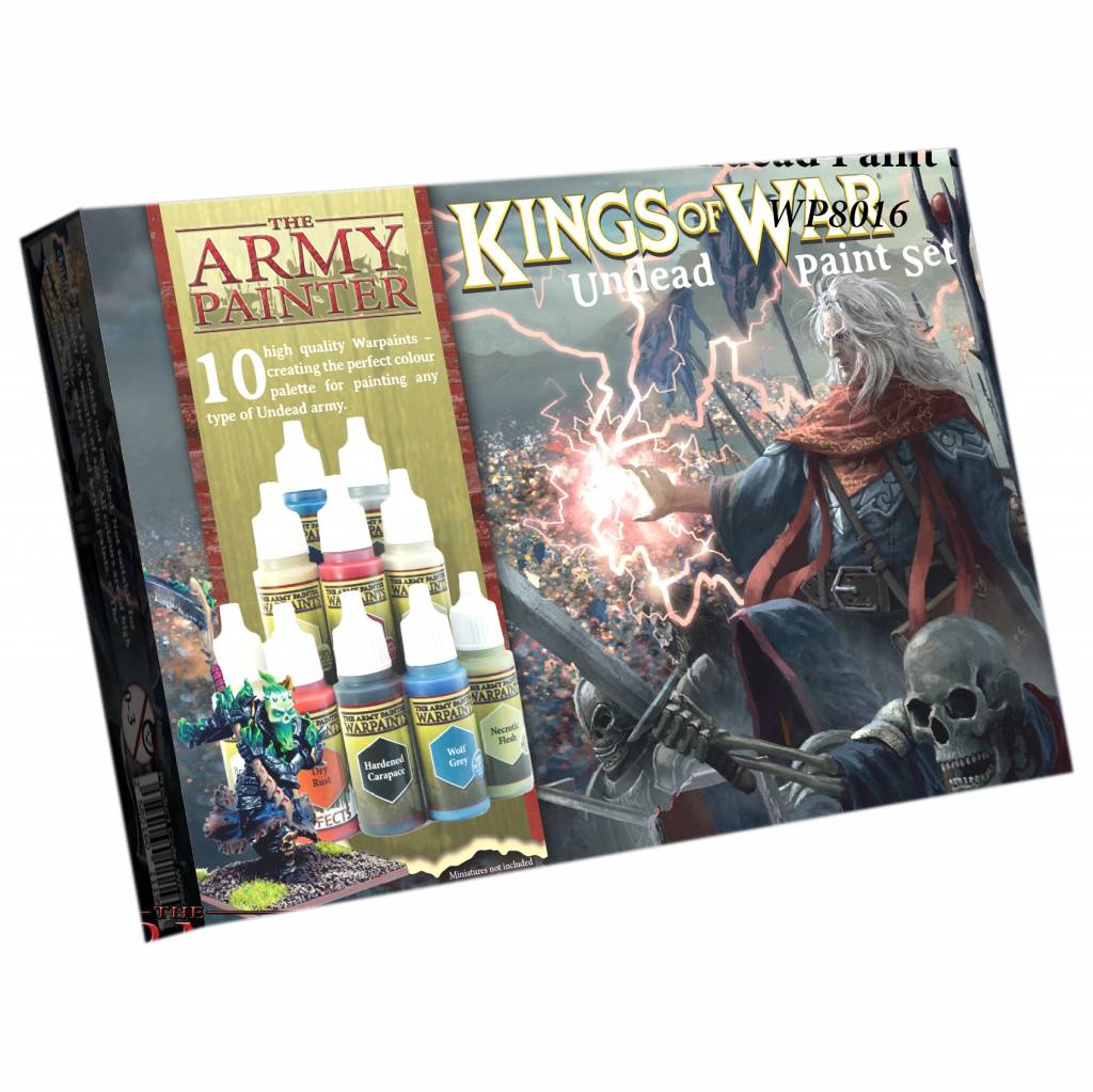 The Army Painter Warpaints Kings of War Undead Paint Set bevat 10 kleuren. Een leger van de Undead is een echt angstaanjagend gezicht. Veel legers wachten zelfs niet om de aanval te krijgen - ze laten hun wapens en rennen weg. Wat ze zien is een leger van de eens zo trotse en grote strijders, die nu weinig meer dan lijken zijn beheerst door de necromancers, geprikkeld in de strijd door hun Lords en Champions.