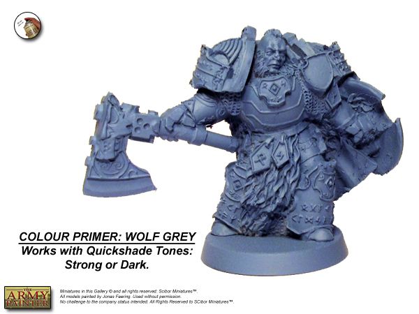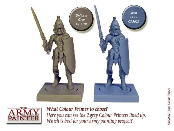 The Army Painter Wolf Grey - Colour Primer, zoals de naam al doet vermoeden lijkt Wolf Grey precies op Space Wolves Grey van GW, waardoor het een onmisbare grondverf is voor de Spacewolves. De blauw grijze kleur dekt perfect.