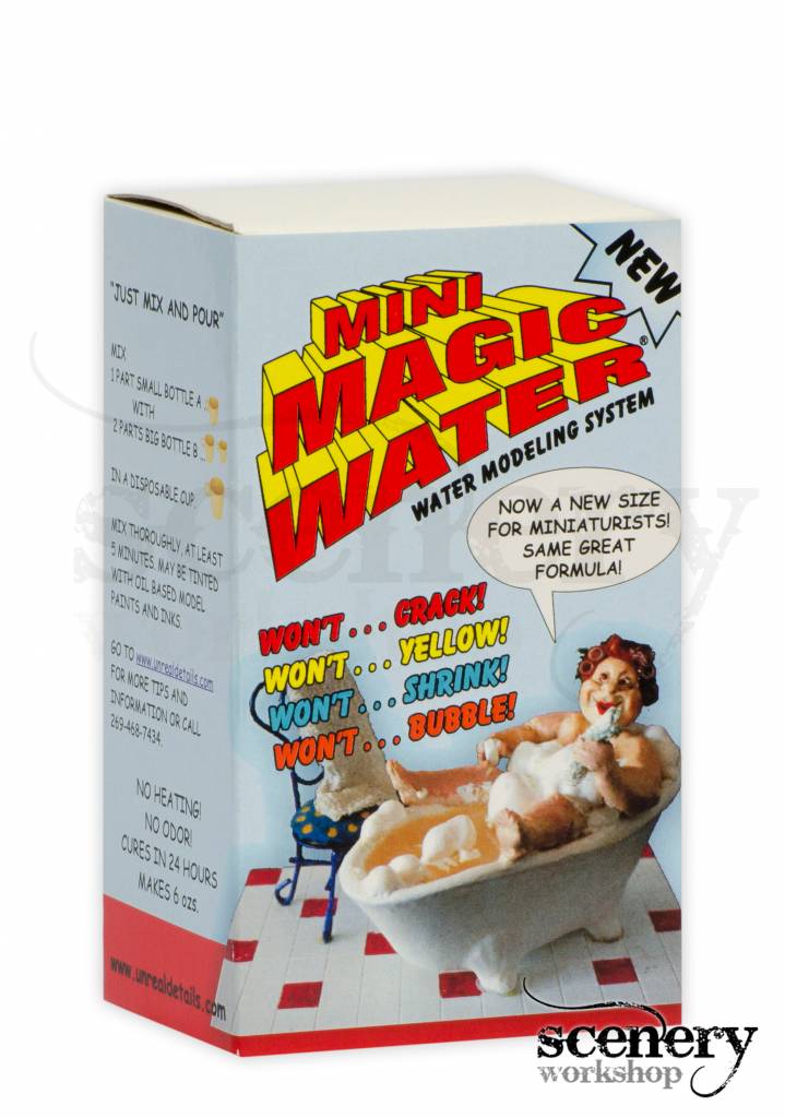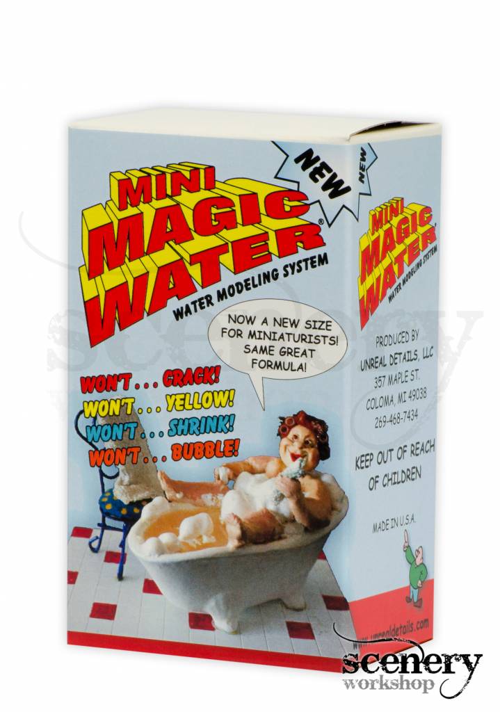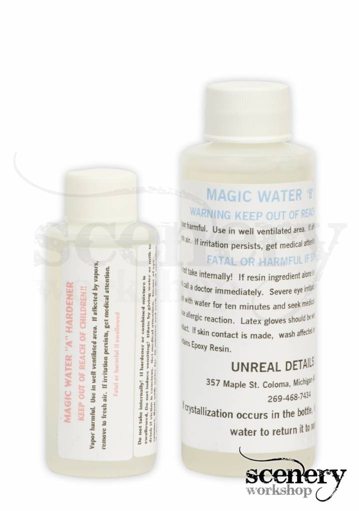 Mini Magic Water, ontwikkeld door Unreal Details, is het resultaat van een lange zoektocht naar dé ideale hars voor het modelleren van water. Hars dat niet geel wordt, niet krimpt, niet scheurt of bubbels achterlaat als er iets in het water ligt zoals zwerfhout of stenen én dat gebruiksvriendelijk is, doordat het bijvoorbeeld niet verhit hoeft te worden, of in vele lagen hoeft te worden opgebracht.