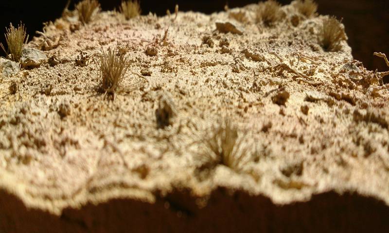 De dikte van het materiaal zorgt ervoor dat er ook een laag relief aangebracht kan worden, zoals bijvoorbeeld bandensporen van tanks en trucks. (tip voor een dieper effect, breng dan meerdere lagen aan, maar let erop dat de lagen in de tussentijd goed gedroogd zijn, anders breekt het oppervlak).