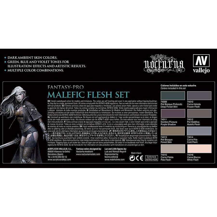 De Fantasy-Pro Malefic Flesh Set bevat 8 kleuren in 17ml eyedropper potjes van de nieuwe verflijn van Vallejo genaamd Fantasy-Pro. Het medium in deze lijn is supermat en bevat kleuren die perfect passen in de hedendaagse trend van diepe rijke kleuren.