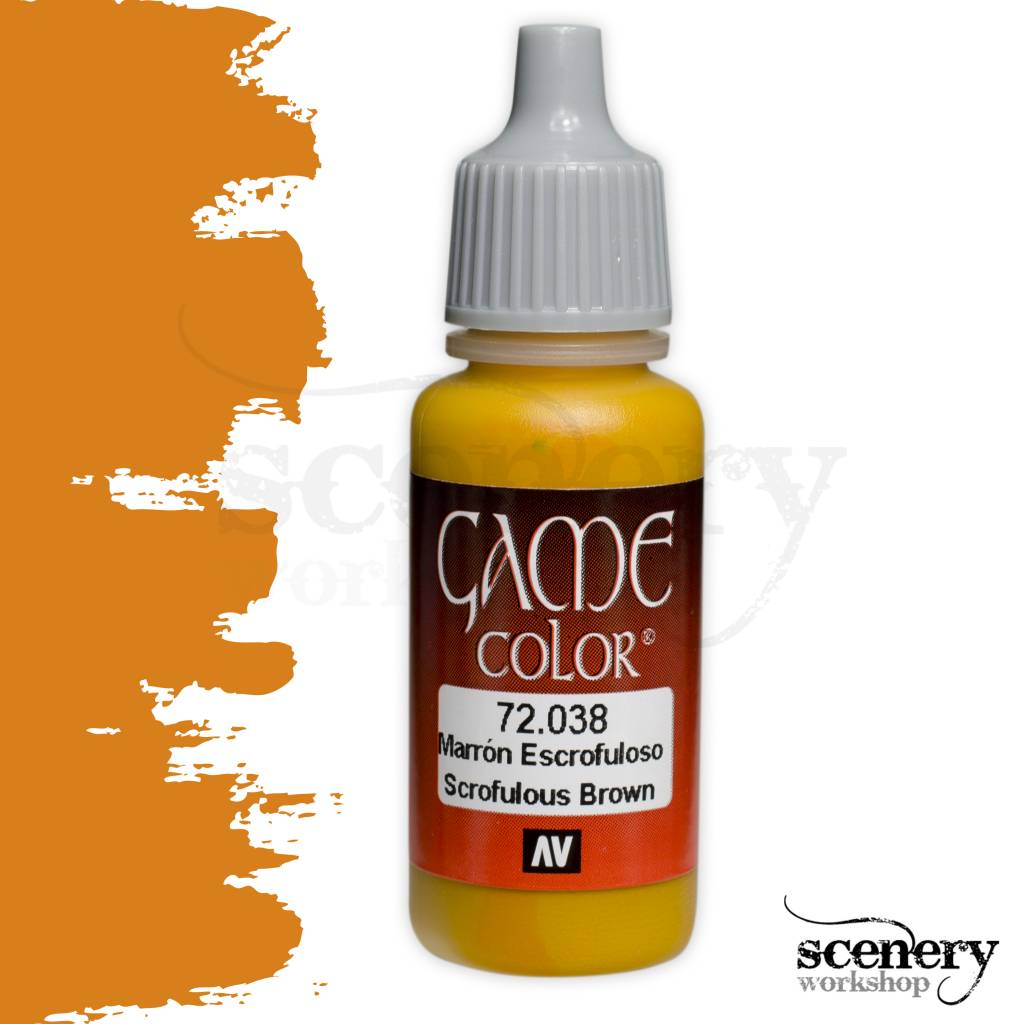Vallejo Game Color Scrofulous Brown maakt deel uit van het Game Color programma van het merk Vallejo en is een bruinoranje acrylverf in een 17ml. eyedropper potje.