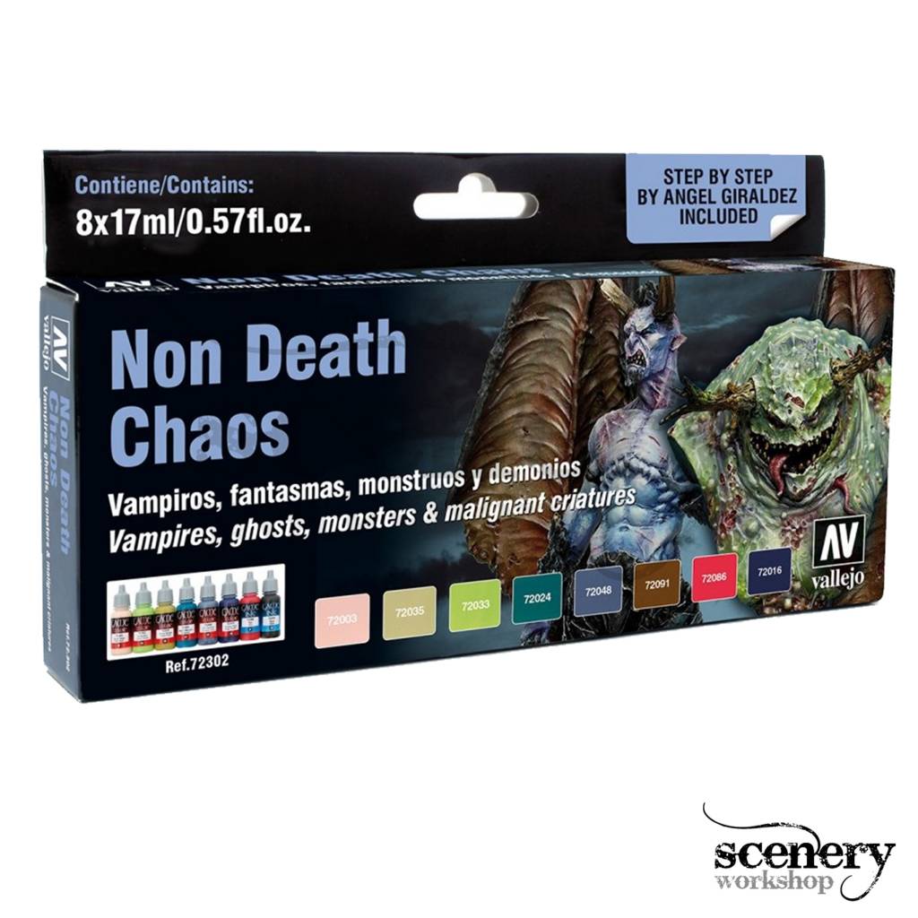 Vallejo Game Color Non Death Chaos set bevat 8 kleuren in 17 ml. eyedropper potjes met een STEP-by-STEP handleiding gemaakt door Angel Giraldez. Deze set is perfect voor het schilderen van Zombies, spoken, monsters, vampieren en demonen._x000D_