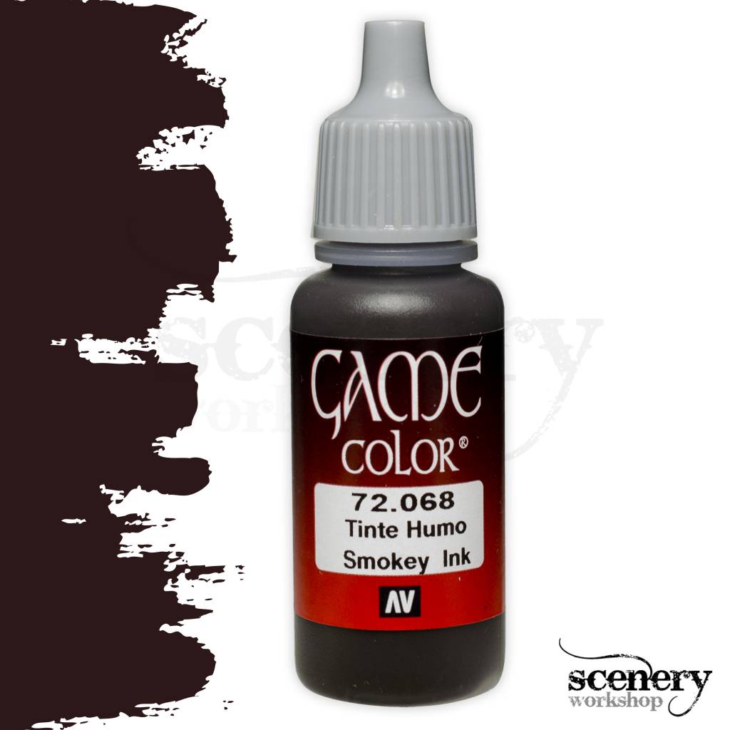 Vallejo Game Color Smokey Ink maakt deel uit van het Game Color programma van het merk Vallejo en is een donkerbruin semi transparante acrylverf in een 17ml. eyedropper potje.