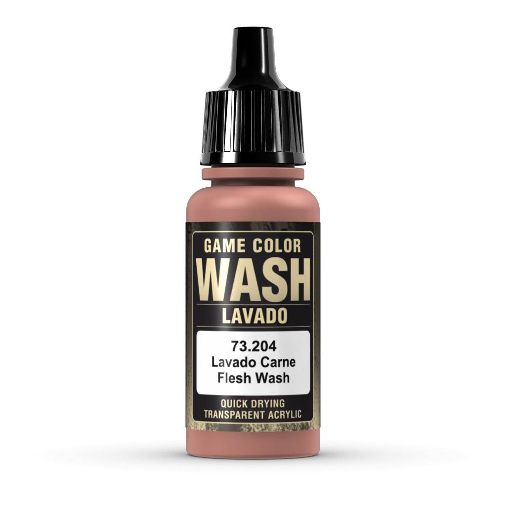 Vallejo Game Color Wash Flesh Shade, deze donkerroze wash is perfect om een huidstint te krijgen in de schaduwdelen van je miniaturen.Â