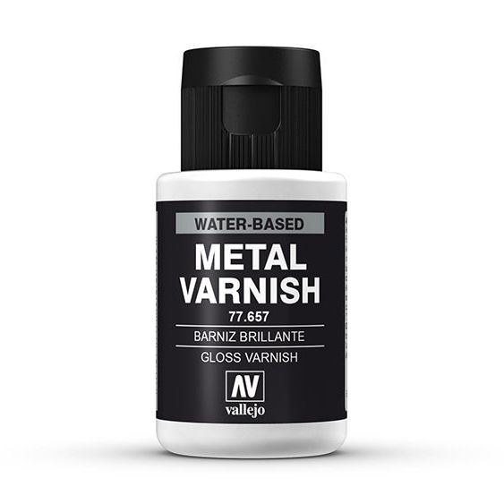 Vallejo Gloss Metal Varnish (77657). Deze nieuwe Metal Vernis is speciaal voor de airbrush geformuleerd, droogt heel snel en laat geen “vingerafdrukken†achter. De vernis kan direct aangebracht worden, maar ook verdund worden met gedestilleerd water of Thinner (71261). In sommige gevallen is één laag vernis genoeg; als meerdere lagen nodig zijn, dan best met een interval van 30 minuten tussen iedere laag. Eenmaal beschermd door vernis, bied Metal Color weerstand tegen olieverf, glazuur, terpentine en zelfs lichte “washes†met alcohol.