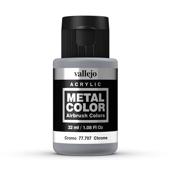 Vallejo Metal Color Chrome (77707) is een chroom kleurige Acryl Airbrush verf dat onderdeel is van de Vallejo Metal Color reeks. Deze metal kleuren op waterbasis zijn speciaal ontwikkeld voor airbrushing. Voor deze serie zijn nieuwe aluminium pigmenten geselecteerd om een kwaliteit te krijgen die tot nu toe niet mogelijk was in metal kleuren op waterbasis.