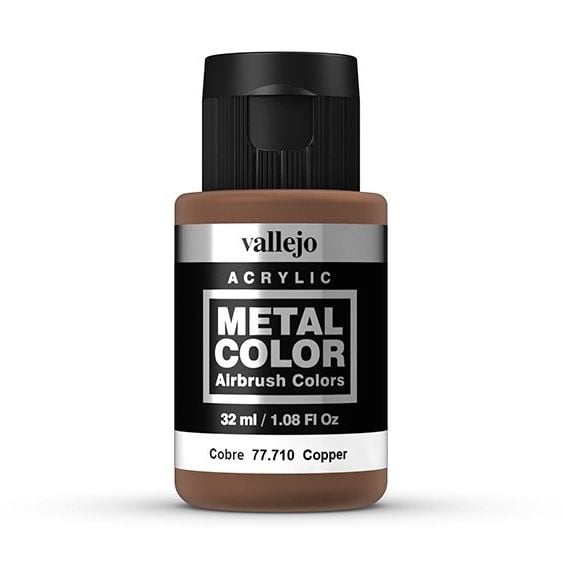 Vallejo Metal Color Copper (77710) is een koper kleurige Acryl Airbrush verf dat onderdeel is van de Vallejo Metal Color reeks. Deze metal kleuren op waterbasis zijn speciaal ontwikkeld voor airbrushing. Voor deze serie zijn nieuwe aluminium pigmenten geselecteerd om een kwaliteit te krijgen die tot nu toe niet mogelijk was in metal kleuren op waterbasis.