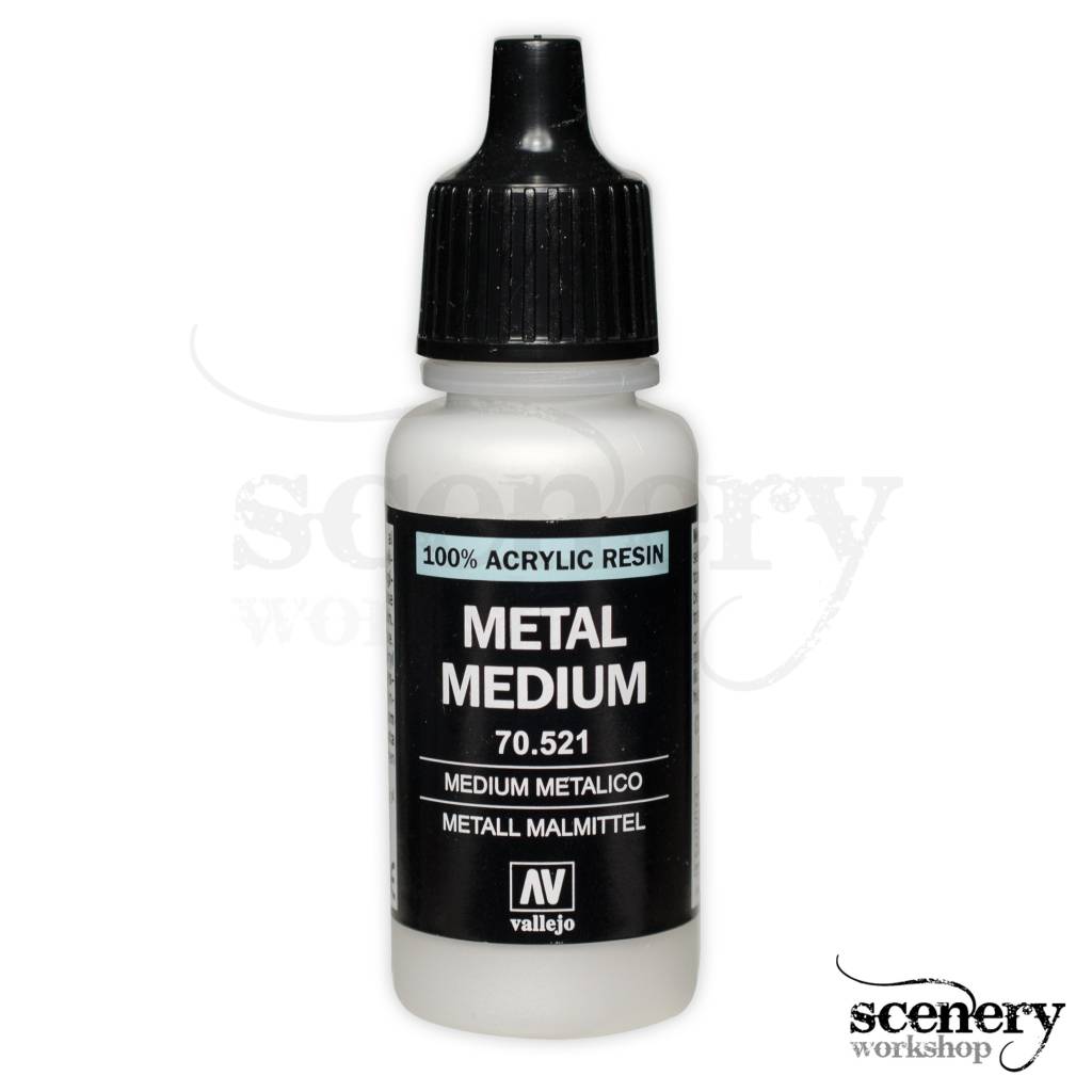 Vallejo Metal Medium (17ml.) wordt gebruikt om de van iedere kleur een metallic kleur te kunnen maken. Vermeng Metal Medium bijvoorbeeld 2 delen acrylkleur en 1 deel metal medium (2:1) om een mooie glans te krijgen in de kleur. Aangezien Metal Medium zo goed als transparant is, wordt het ook veel gebruikt om bijvoorbeeld NMM (Non-Metal-Metal) de laatste highlight een glimmer mee te geven waardoor het licht net iets meer gevangen wordt.