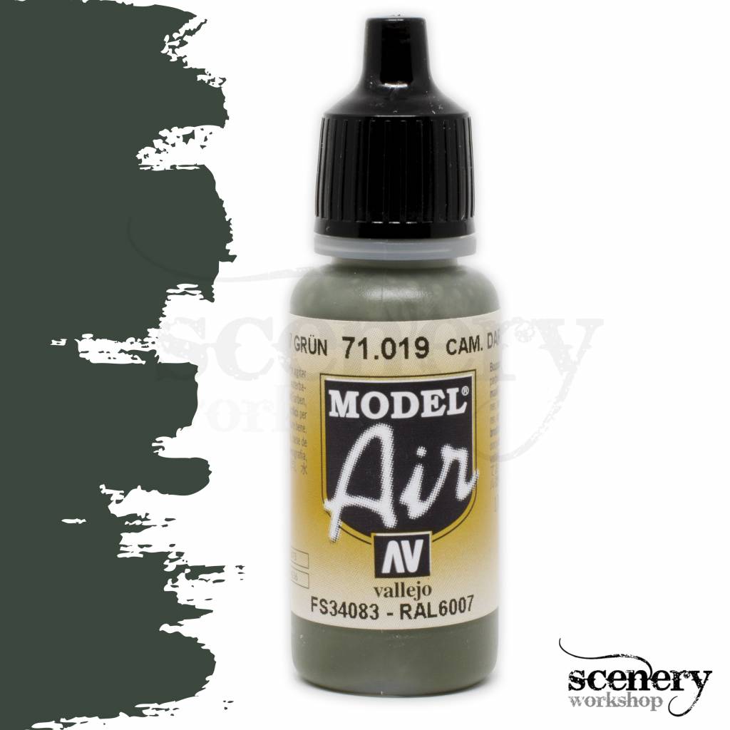 De kleur van Vallejo Model Air Cam. Dark Green (71.019) is vergelijkbaar met: Federal Standard: 34064; RAL: 6007; Humbrol 91; Tamiya XF27; Vallejo Model Color: 70979.