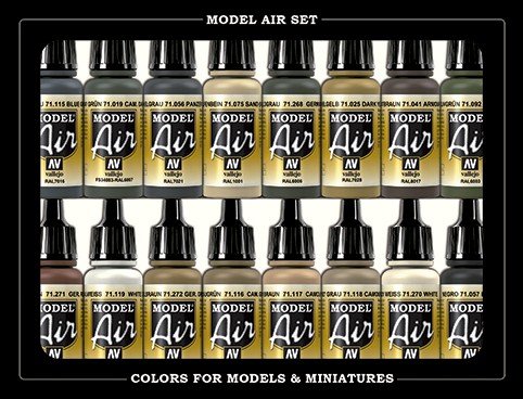 Vallejo Model Air German Colors WWII Europe & Africa (71208) is een set van 16 Model Air kleuren om modellen en miniaturen te schilderen speciaal voor gebruik met de airbrush. Deze set heeft kleuren die gebruikt worden voor Duitse voertuigen tijdens WWII. De set bevat 16 eyedropper flesjes Vallejo Model Air met 17ml. acrylverf.