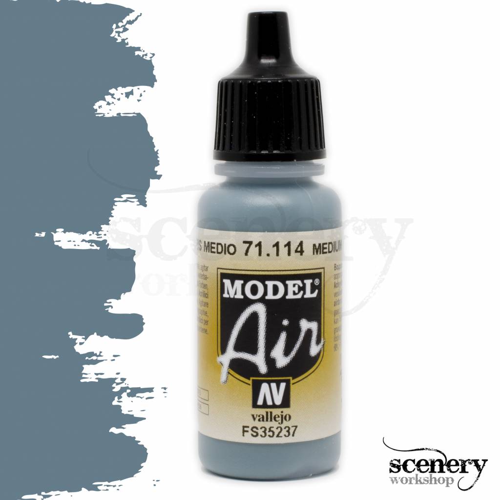 Vallejo Model Air Medium Gray maakt deel uit van het Model Air programma van het merk Vallejo, speciaal ontwikkeld voor de airbrush en is een grijsblauwe acrylverf in een 17ml. eyedropper potje.