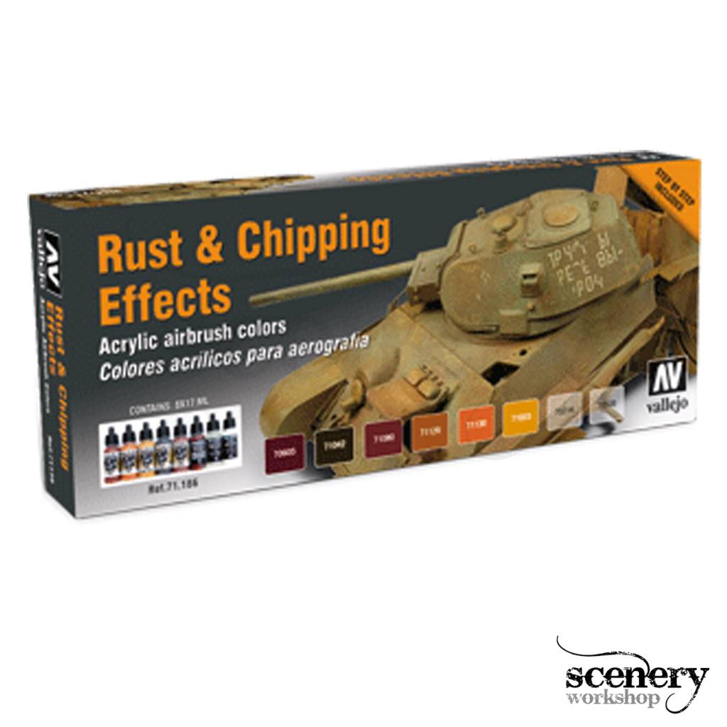 Vallejo Model Air Rust & Chipping Effects is een set van 6 kleuren Model Air verf en 2 mediums om modellen en miniaturen te voorzien van verweerd staal en ijzer. Deze set is uitermate geschikt voor het aanbrengen van roest op schepen en vliegtuigen en de roestplekken door aanvallen op tanks en andere voertuigen.Â