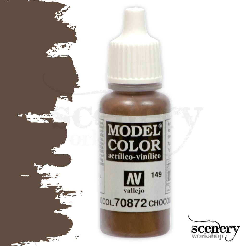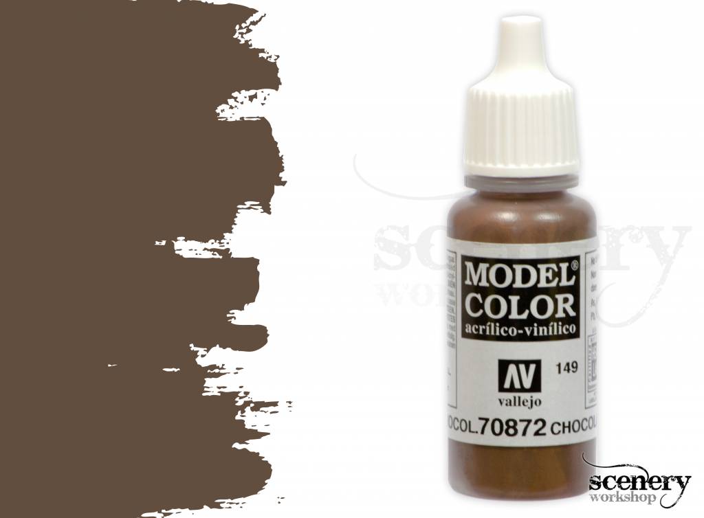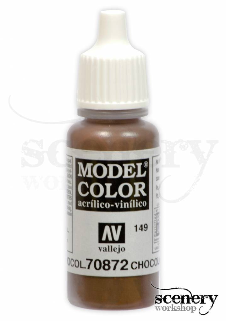 Vallejo Model Color Chocolat Brown maakt deel uit van het Model Color programma van het merk Vallejo en is een chocolade bruine acrylverf in een 17ml. eyedropper potje.