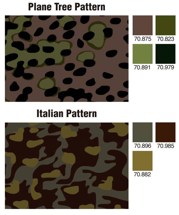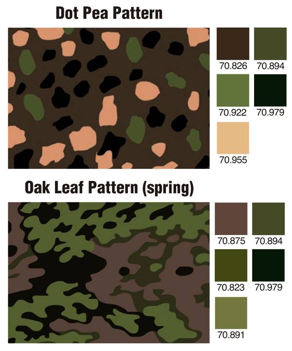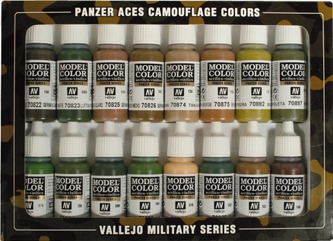 Vallejo Model Color Panzer Aces Camouflage Colors + gratis penseel (70179) is een set van 16 Model Color kleuren die de Panzer Aces serie aanvullen met een selectie kleuren voor het Dot Pea Patroon, het Italiaanse Patroon, Plane Tree patroon en het Oak Leaf patroon.