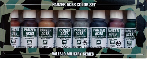 Vallejo Model Color Panzer Aces Nº1 - Roest, sporen en rubber (70122) bevat 8 Panzer Aces kleuren in 17ml. eyedropper potjes. Iedere set van Panzer Aces bevat een selectie speciale kleuren waarbij deze set vooral helpt bij het kleuren van roest, bandensporen en rubber.