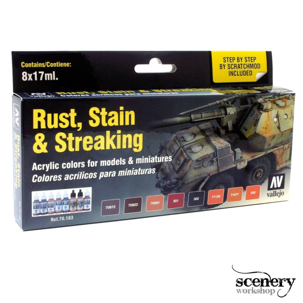 De Vallejo Rust, Stain and streaking bevat speciaal geselecteerde kleuren om weathering effecten te bereiken zoals roest op metalen oppervlakken, het afbladeren van verf en de getrokken sporen van roest en kalk. Dit soort effecten vinden normaal gesproken plaats door weersinvloeden zoals wind, regen en zon, maar zijn nu met enkele simpele penseelstreken eenvoudig na te bootsen. De foto's in het stappenplan dat bij de set geleverd is helpt bij het maken van deze verweerde effecten.