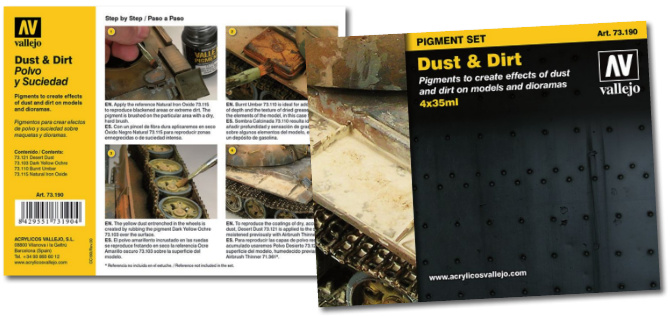Vallejo Pigment Set Dust & Dirt bevat 4 potjes pigment van 35ml. Met deze set pigmenten kan onder andere stof en vuil nagebootst worden. Vermeng de pigmenten met bijvoorbeeld matte vernis of glaze. Daarnaast heeft deze set een stap-voor-stap handleiding van Chema Cabrero om je te helpen bij het maken van deze effecten.