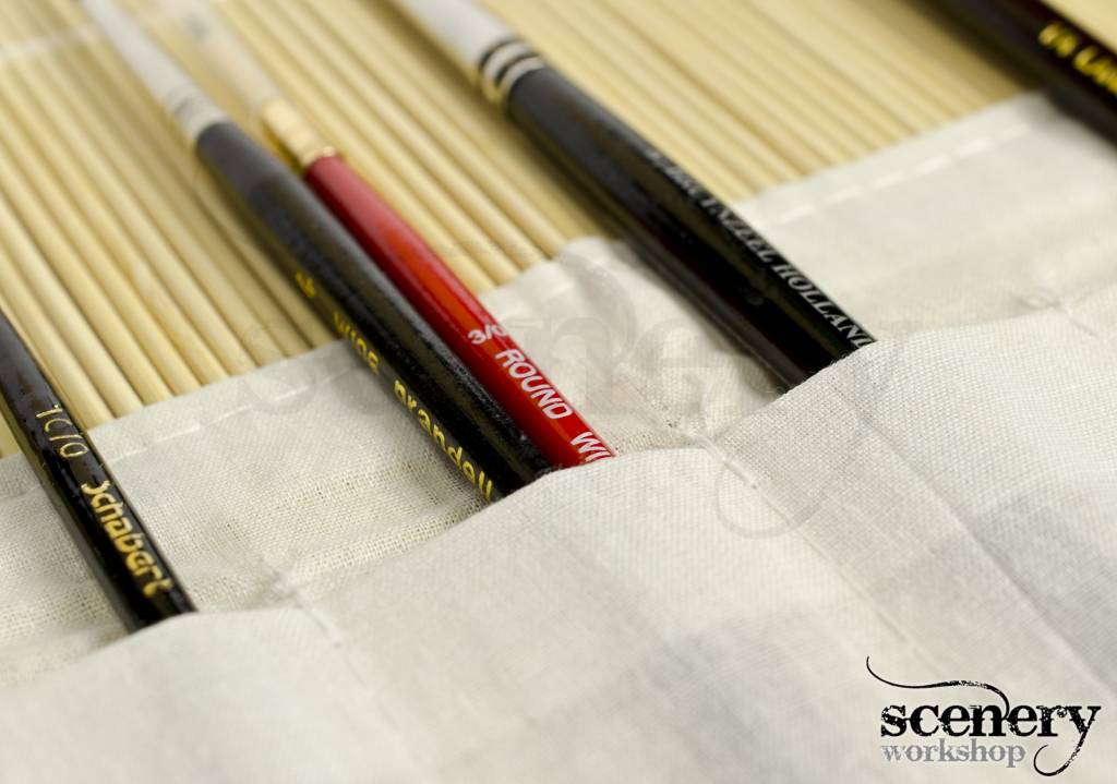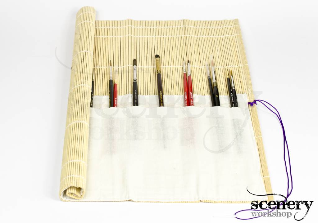 Deze grote bamboe penselen rol is voor zien van een katoenen houder waardoor je penselen nog steviger en veiliger in je rol blijven zitten. Door ze in de katoenen "zakjes" te schuiven blijven ze altijd op hun plek. Rol de bamboe op en bind het vast met het koord. Nu kun je je penselen goed en beschermd overal mee naartoe nemen.