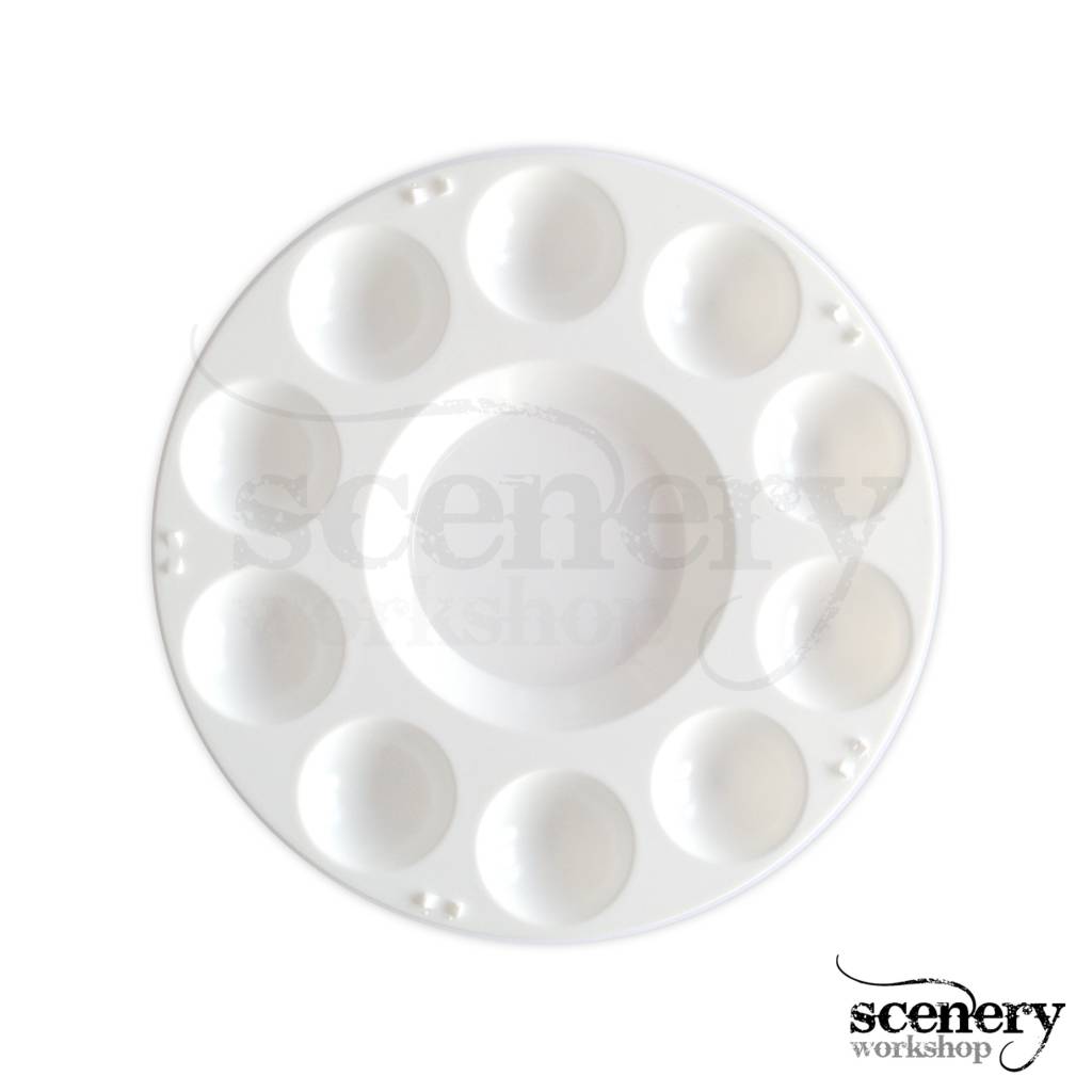 Vang Palet (rond) 18cm diameter gemaakt van hard plastic. Dit palet bevat 11 vakken waarvan 10 kleine ronde en 1 groot vak in het midden. Daarnaast is het palet voorzien van 5 halfronde houders waarop penselen gelegd kunnen worden, zodat ze niet wegrollen.
