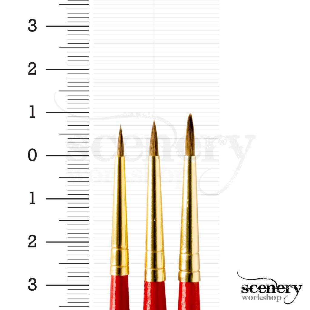 De set bevat 3 ronde penselen met een rode steel en goudkleurig ferrule: