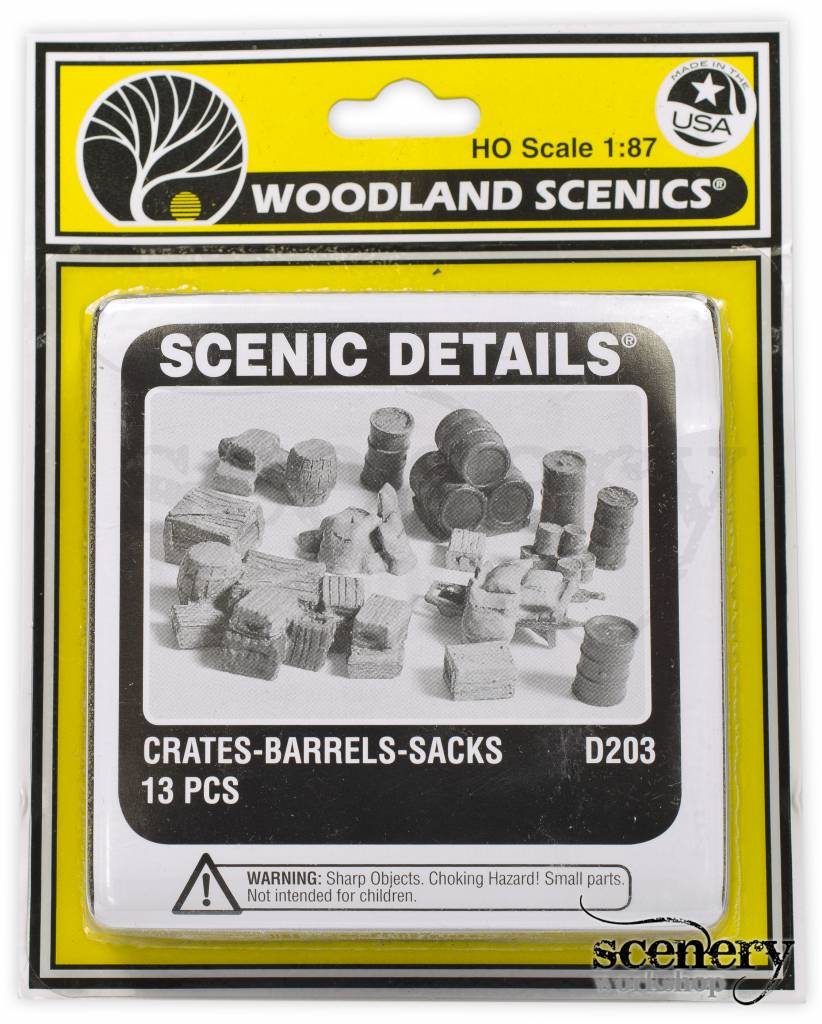 Woodland Scenics crates, barrels and sacks is een geweldige collectie olievaten, kratten en voederzakken. Ze zijn fantastisch als ze tegen schuurtjes, huizen, boederijen en nog veel meer aan staan. Deze verzameling is op HO formaat dat wil zeggen 1:87, iets kleiner dan 28mm, maar misstaat niet als scenery op deze schaal.